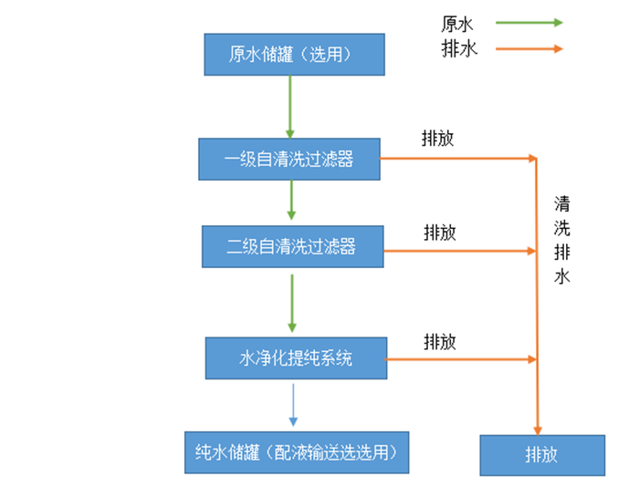 原水罐(选配)→一级自清洗过滤器→二级自清洗过滤器→水净化提纯设备→纯水储罐+配液输送